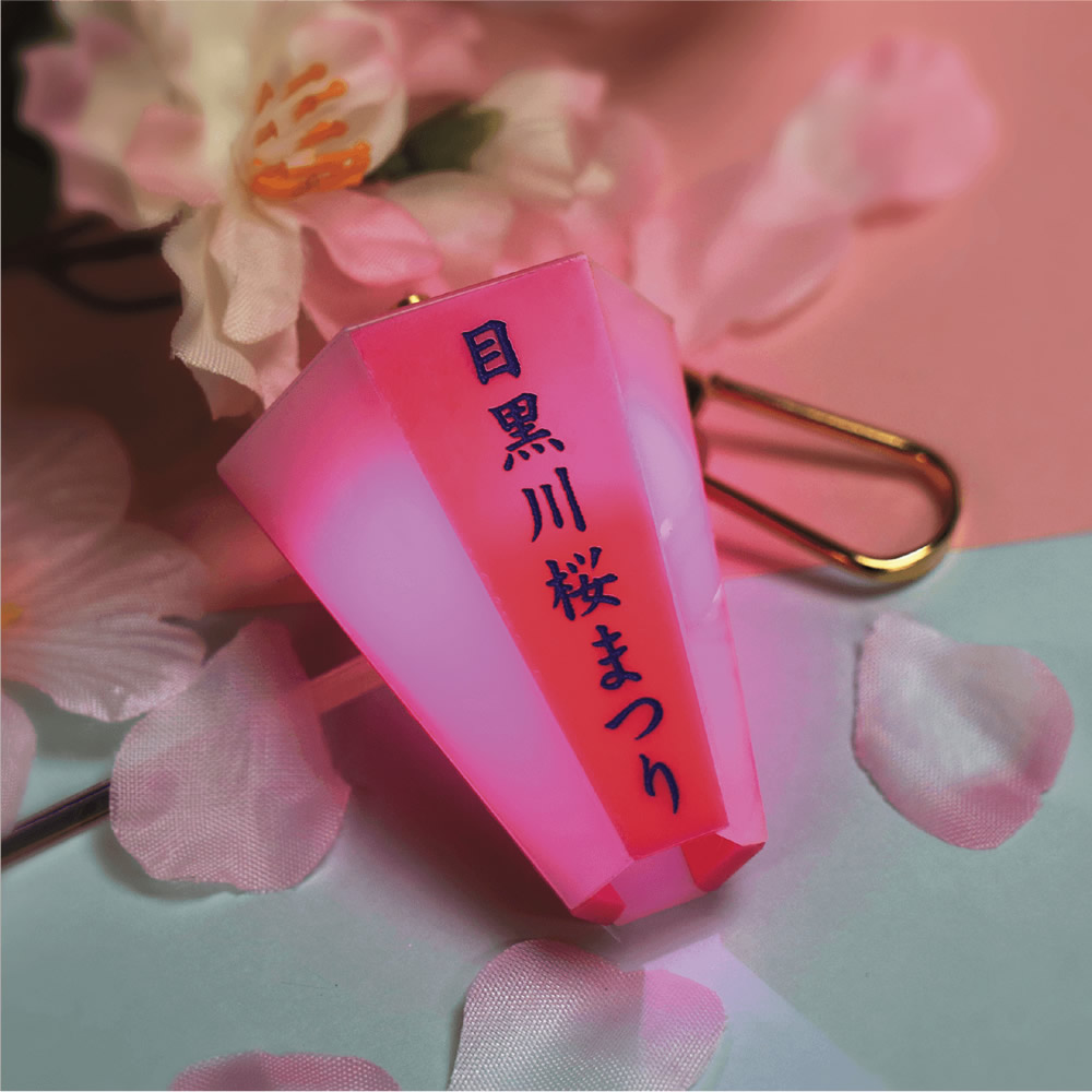 桜満開の目黒川を彩るぼんぼりをキーホルダーにしました!上部を回すと七色に点灯!公式HPからは本物同様名入れができます!